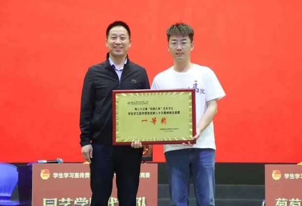 旗帜引领方向,思想凝聚力量。在此次比赛中,我们通过二十大知识在线答题、微党课展示、现场答题等形式学习党的二十大报告内容,学思践悟,从党的二十大报告中汲取奋进力量,汲取智慧和力量。特别是在决赛中前期稳扎稳打,厚积薄发,后期一马当先,势如破竹,最终取得本次比赛一等奖。“学而不思则罔”,在学习中要坚持理论联系实际,这是党的三大优良作风之一,也是我们学习的目的。我们要从学习中激发斗志、增强本领、激发活力,切实担负起实现中华民族伟大复兴中国梦的时代重任。学习是一种习惯,更是一种态度。青年是我们人生道路上重要的学习阶段,在学习中提升自我修养,用党的最新理论武装头脑、指导实践、推动工作。积极响应党的号召,发扬“知行合一、经世致用”精神,为祖国建设贡献自己的青春和力量。