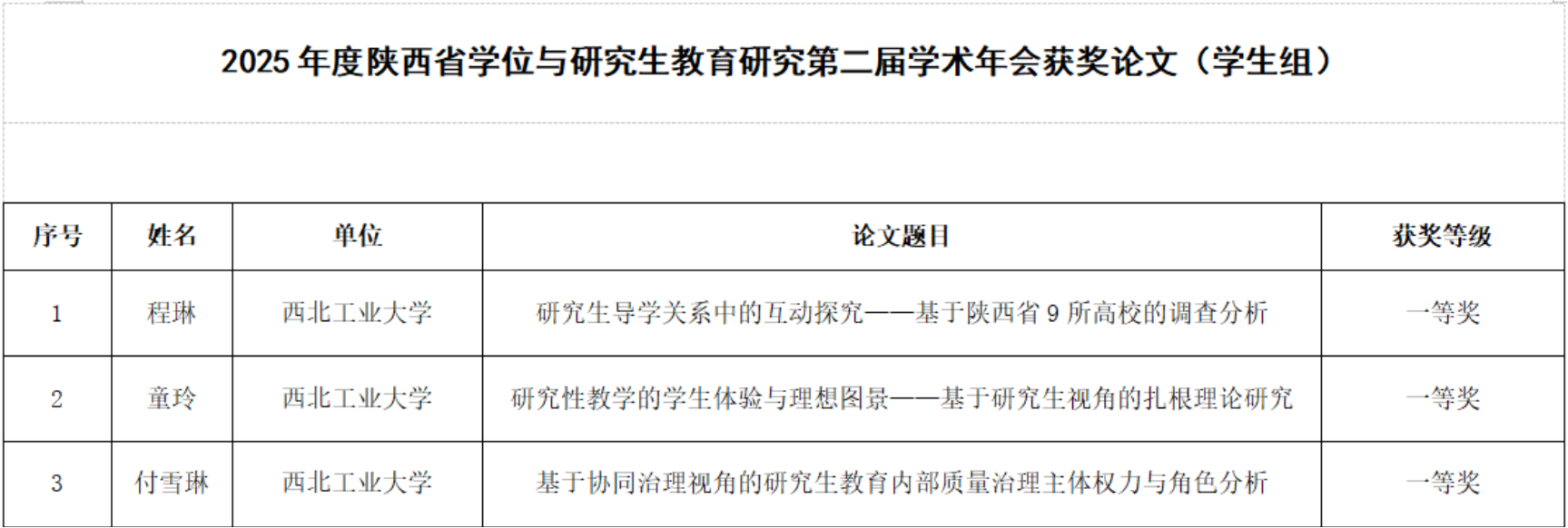 陕西省学位与研究生教育研究中心是由陕西省教育厅批准,依托西北工业大学设立的专门从事学位与研究生教育研究的学术机构。本次年会以“研究生高质量发展助力教育强国新征程”为主题,按照“陕西省学位与研究生教育研究中心第二届学术年会及征文预通知”要求,结合“陕西省学位与研究生教育研究中心学术年会优秀论文评审办法”,经资格审查、专家初审、复评、监督与审定等环节,拟确定获奖论文共97篇,其中教师组42篇,学生组55篇。