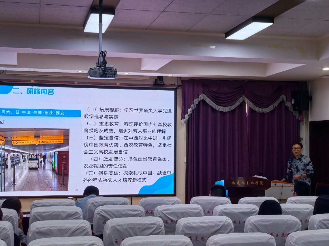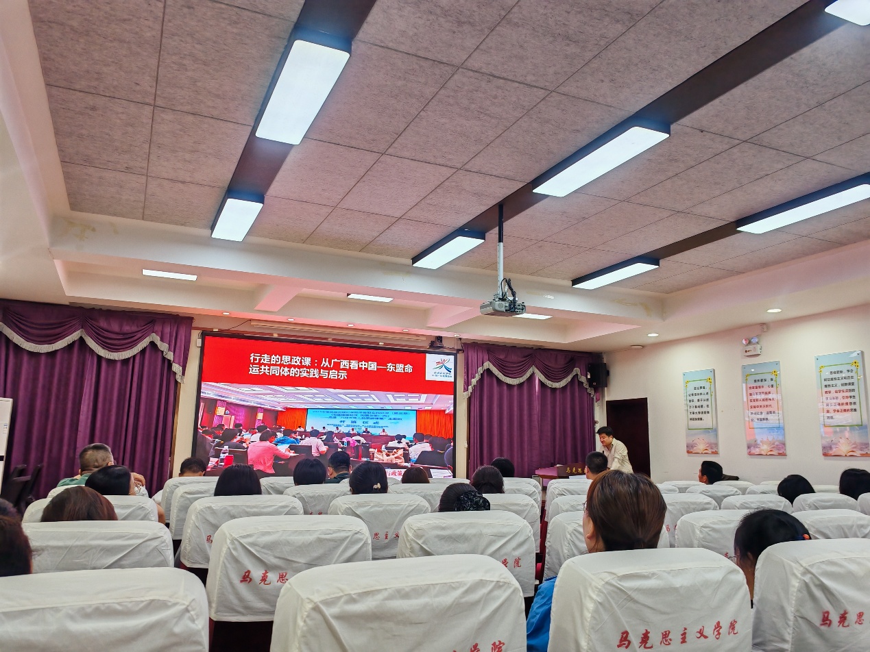 会上,学院党委副书记、副院长王家武通过详实的数据与生动的案例对思政课教师在广西大学进行的研修情况进行了总结汇报,带领全体教师沉浸式感受革命老区红色场馆的育人魅力,为思政课教学注入鲜活素材。各教研室教师代表赵昂、李若凡、汪钊、李沛莉、杨玉龙、崔建利结合一线教学实践,围绕“把道理讲活”分享了教学案例。老师们从广西民族团结进步的鲜活故事切入,阐释“共同体意识”;从学生困惑出发,设计“中国式现代化”教学环节;更有对爱国主义历史范畴的深度思考,展现出将“大道理”转化为“身边事”的用心探索,为后续教学改革提供了丰富思路。在国际视野与技术赋能分享环节,赴牛津大学参加研修的何景毅、杨玉龙两位老师介绍了国外高等教育在教学方法、课程设计上的创新举措,为学院思政课教学带来新启发;余雯老师开展 AI 赋能教学培训分享,明确技术并非思政课的对立面,而是可助力分析学生关注点、增强历史代入感的重要工具,为教学创新指明了方向。杨君老师以红旗渠精神为主题进行党支部书记培训分享,强调党建在育人工作中的引领作用,让在场教师深刻感受到思政课教师的责任与担当。