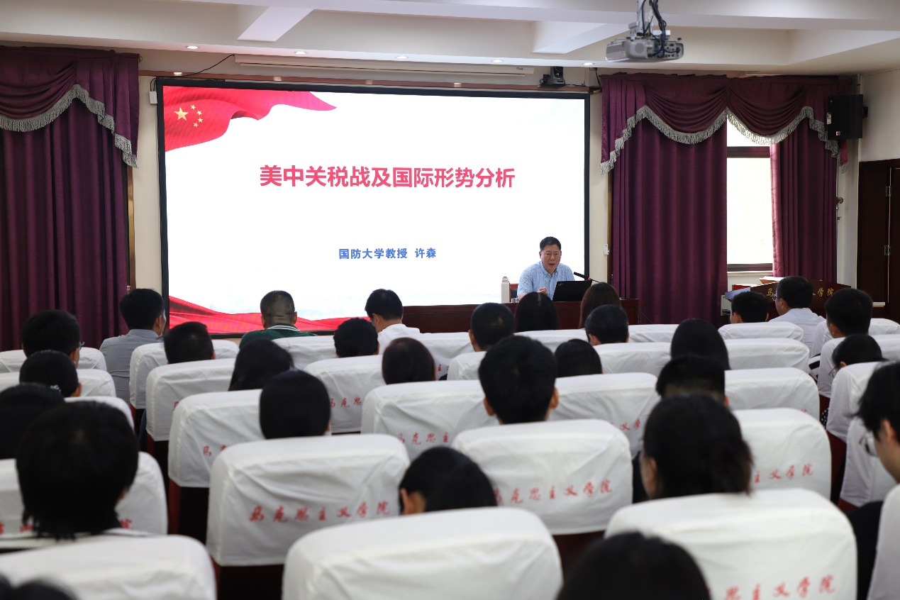 5月14日,永利官网特邀国防大学教授许森做客凤岗讲堂,围绕“美中关税战及国际形势分析”作专题报告。许森教授结合当前国际局势,深入剖析了美国发动全球关税战的动因、中美贸易失衡的深层逻辑及中国的战略应对策略。会议由学院党委书记闫德忠主持,永利官网全体师生参加。