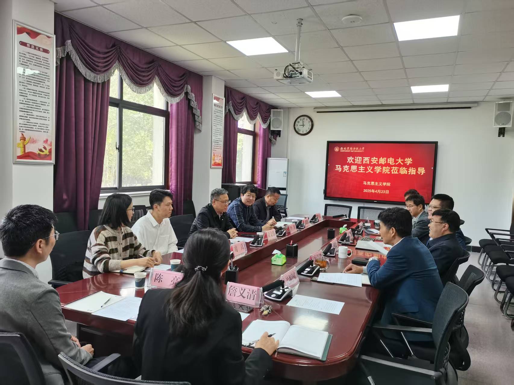 互鉴互学,共谋发展。座谈会上,双方首先介绍了各自学院的发展历程与办学特色。杨鹏院长重点分享了学院的学科建设情况和成果,强调学院近年来以农林学科特色为依托,探索“理论+实践”双轨并行的育人模式,并将党的创新理论融入思政课教学全过程,形成服务乡村振兴的思政品牌。殷旭辉副院长重点介绍了学院的教学情况及特色。西安邮电大学马院院长袁文伟教授对学院的创新实践表示赞赏,并以“微电影+思政”实践教学模式的探索与思考为题重点介绍了西安邮电大学思政课建设的新探索。他提到,学校通过特色模式,将党的理论创新成果转化为鲜活的教学案例,连续多年组织学生参与“我心中的思政课”全国大学生微电影展示活动,以学生视角讲好中国故事,深受师生好评。